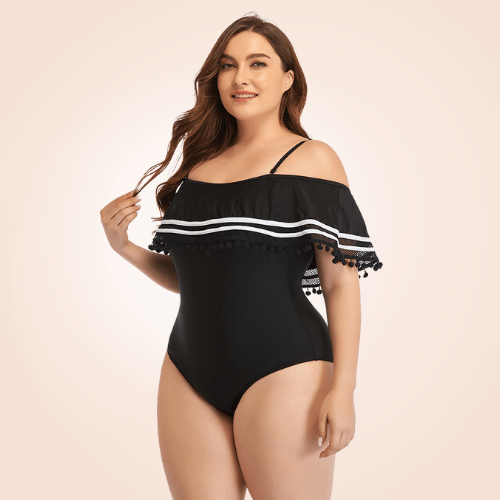 Plus-Size Rüschensaum Off-Shoulder Gestreifter Volant Einteiliger Badeanzug